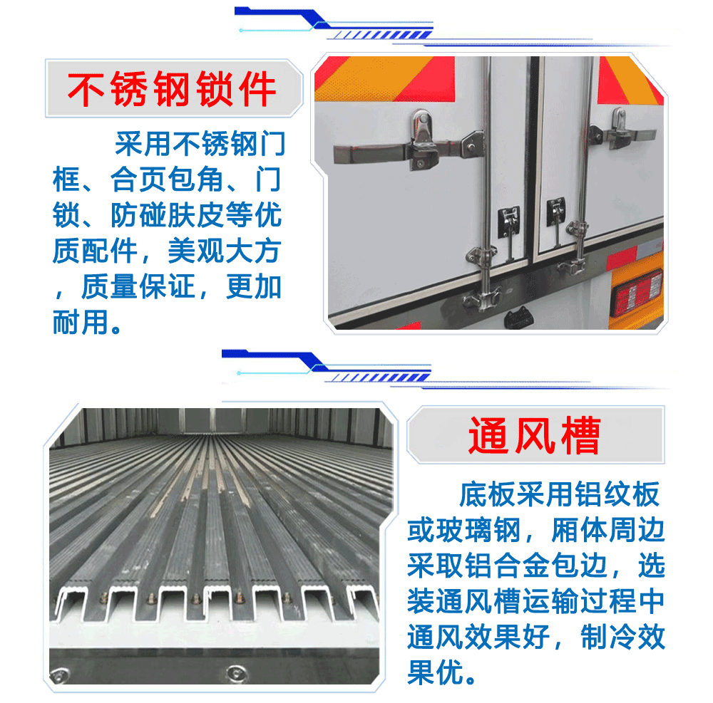 上裝配置:箱體為內外玻璃鋼板,中間保溫材料為8cm聚氨酯保溫板,鋁花紋底板,箱體鋁合金型材包邊,包角,配雙開后門,單開側門,不銹鋼門框、鎖件、鉸鏈,其余